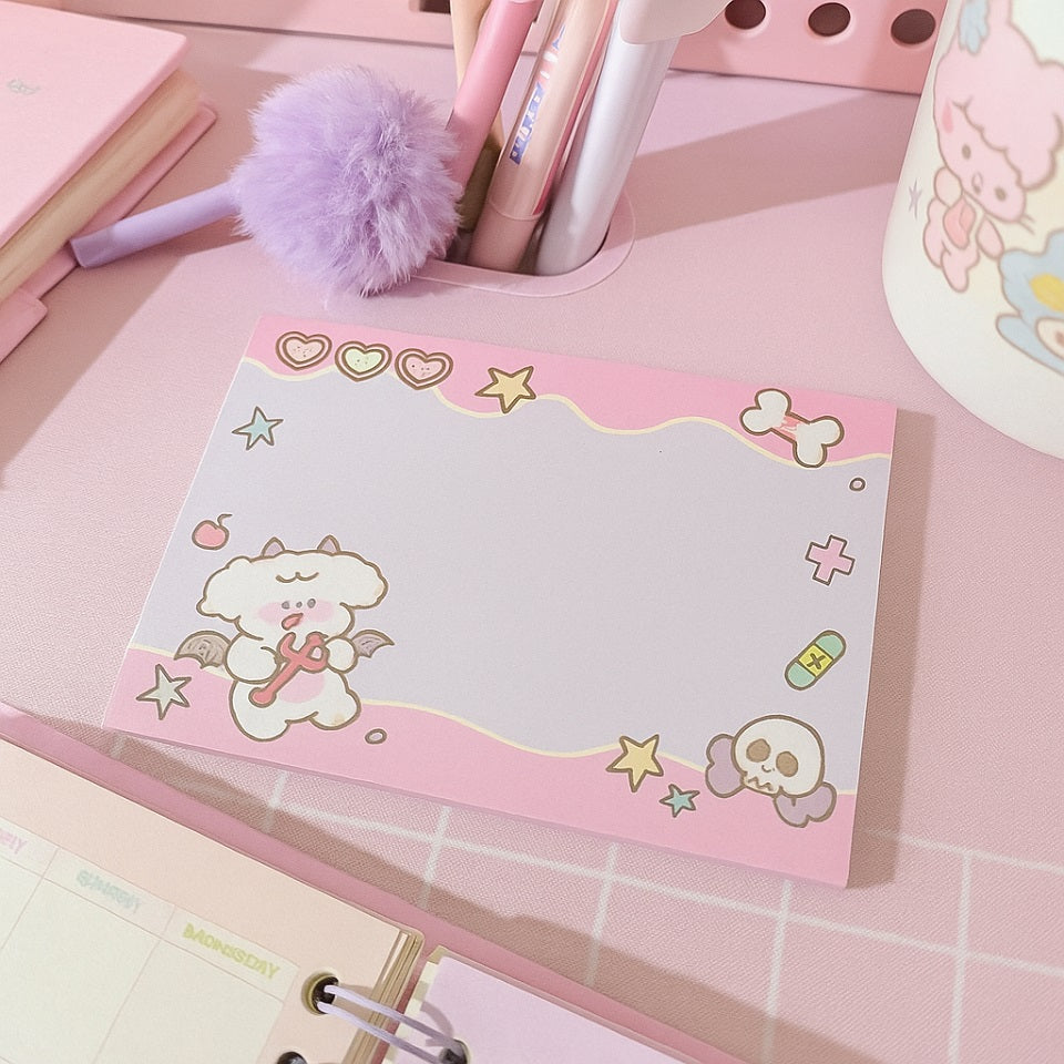 Découvrez ce bloc-notes au design unique d’un chien blanc kawaii façon chibi démoniaque, avec ses ailes de démon et sa petite fourche. Les touches de rose apportent une douceur irrésistible, mêlant charme kawaii et esprit monster ultra mignon. Compact et pratique, il est idéal pour noter vos idées, rappels ou petits mots, et se glisse facilement dans votre sac pour vous accompagner partout.