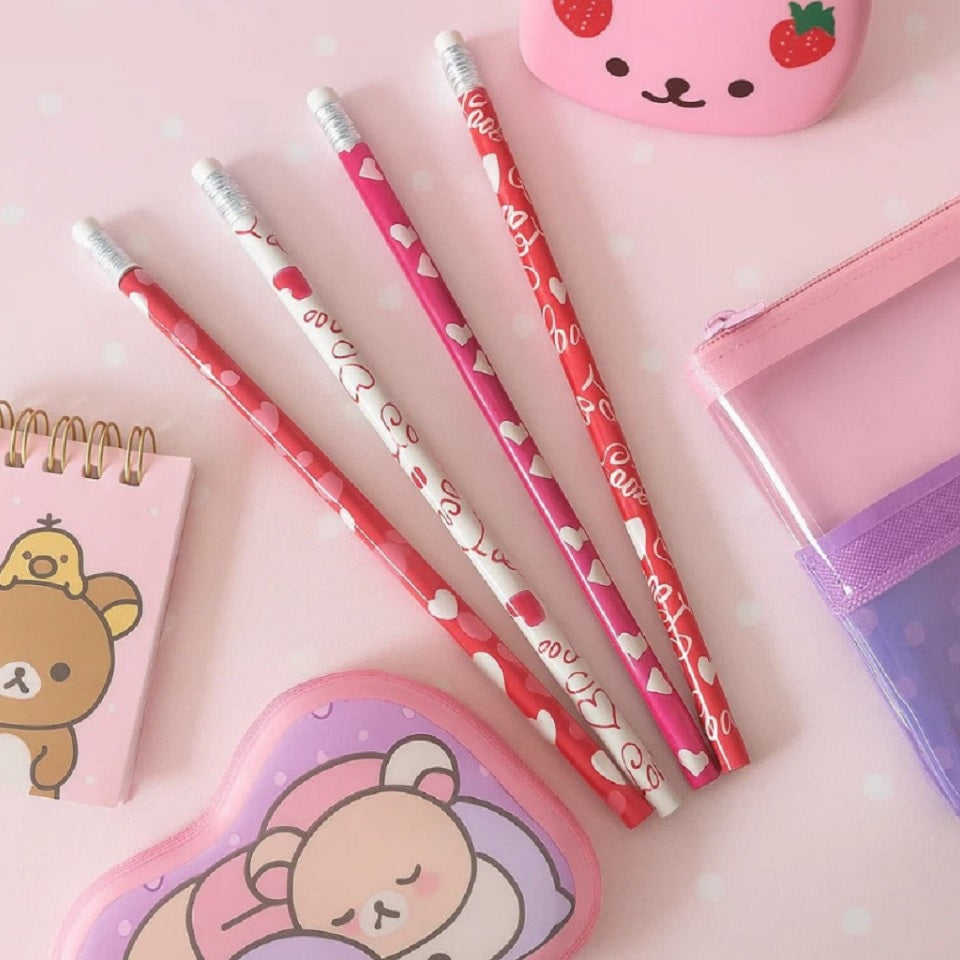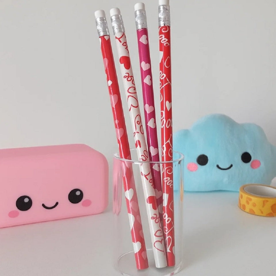 Retrouvez une ambiance romantique đ avec ces crayons Ă papier dĂ©licatement dĂ©corĂ©s de motifs de cĆurs et dâinscriptions "Love". Chaque dĂ©tail respire la tendresse : du design adorable aux couleurs douces qui Ă©voquent les papillons dans le ventre et les petits mots glissĂ©s en secret. âïž
