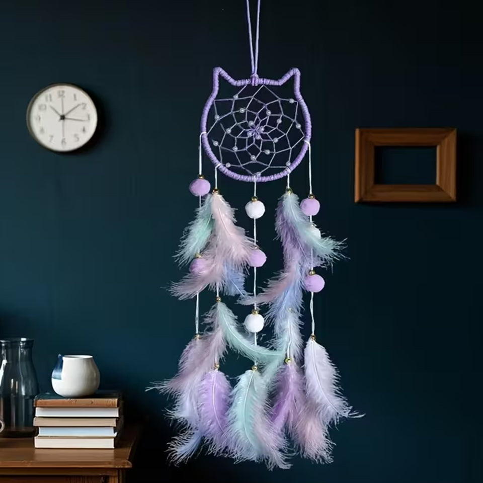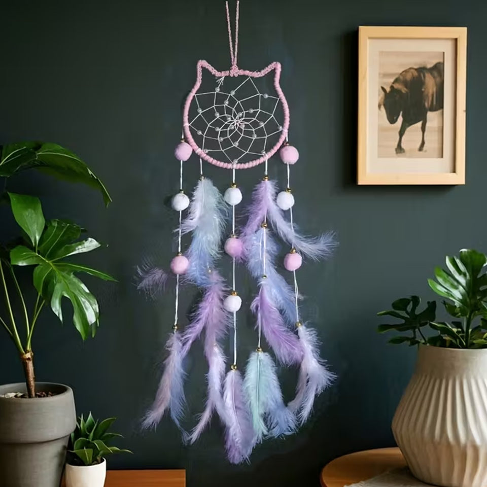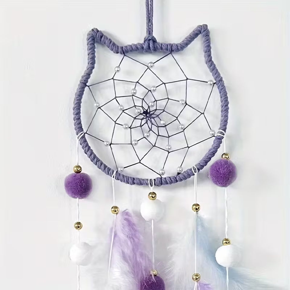 - un attrape-rêves original et tout doux en forme de chat avec plumes et perles (coloris rose ou mauve/long: 65cm)