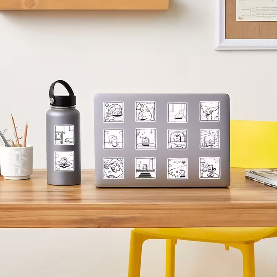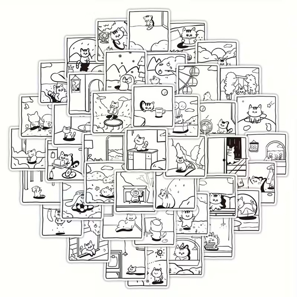- deux planches de stickers chats en noir et blanc, idéals à colorier (modèles aléatoires)