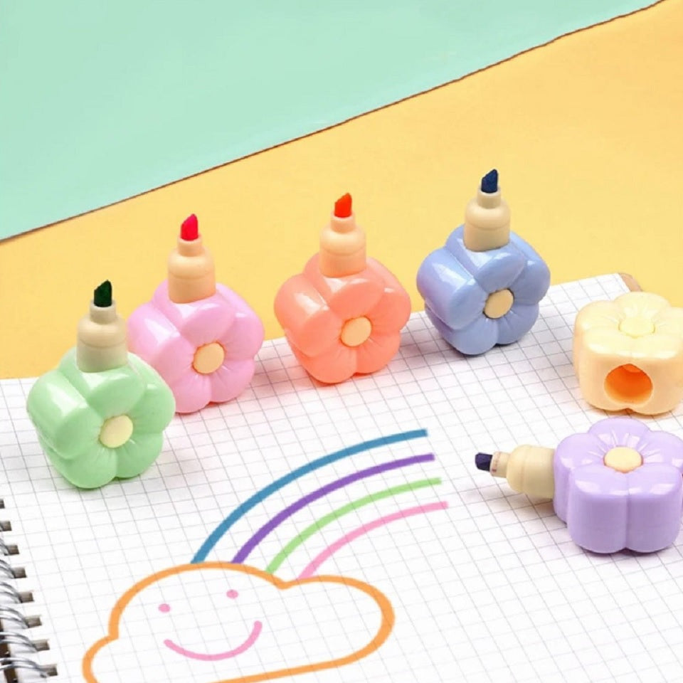 Vendu par lot de 5 surligneurs en forme de fleurs (jaune, vert, rose, bleu et violet) + 1 bouchon